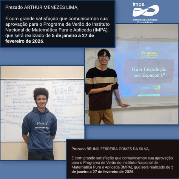 O Curso de Matemática do Centro de Ciências e Tecnologia (CCT) tem a satisfação de compartilhar uma excelente conquista: os estudantes Arthur Menezes Lima e Bruno Ferreira Gomes da Silva, ambos do 5º semestre da Licenciatura em Matemática da Universidade Estadual do Ceará (UECE), foram aceitos com bolsa no Programa de Verão do Instituto de Matemática Pura e Aplicada (IMPA), um dos mais prestigiados centros de pesquisa da América Latina em Matemática localizado no Rio de Janeiro!!