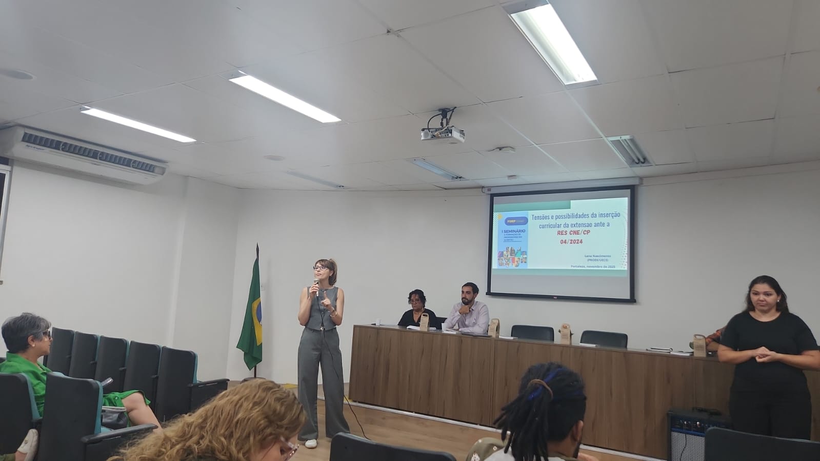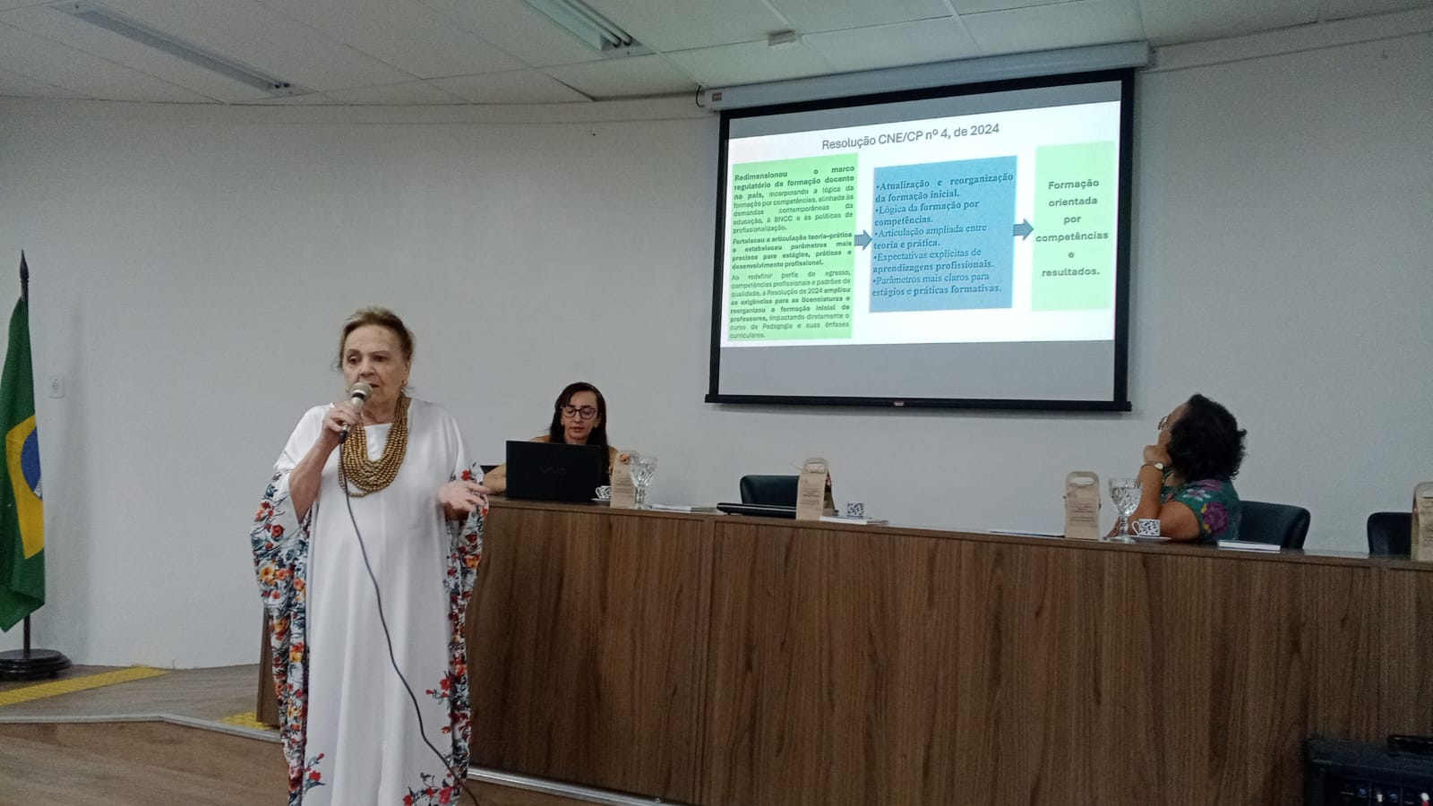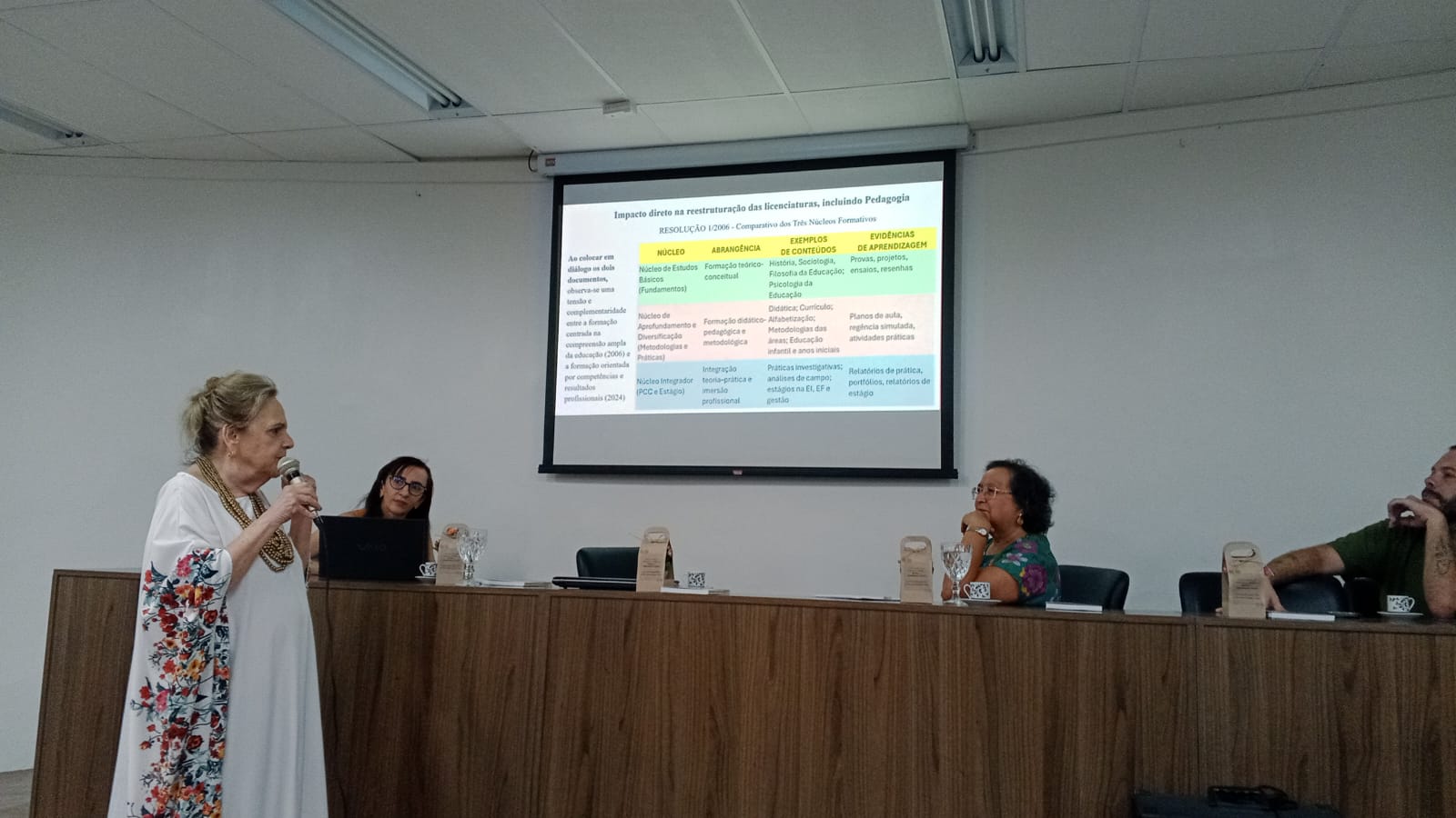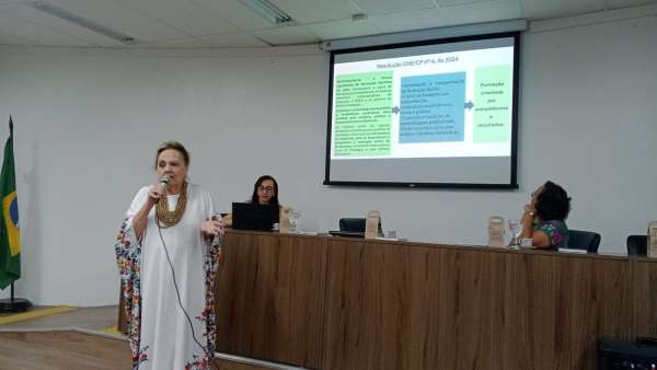 A conferência inaugural tratou do tema “A formação de professores no contexto da Resolução CNE/CP nº 04/2024: tensões, impactos e desdobramentos curriculares”, apresentada pela professora Isabel Sabino, e mediada pela professora Mônica Abu-El-Haj.