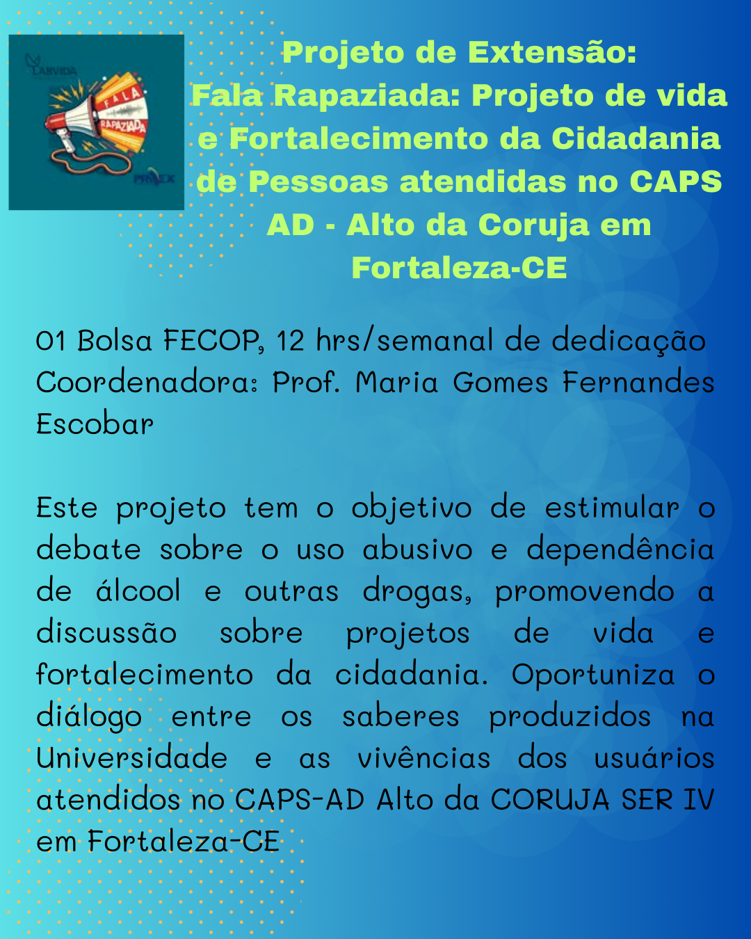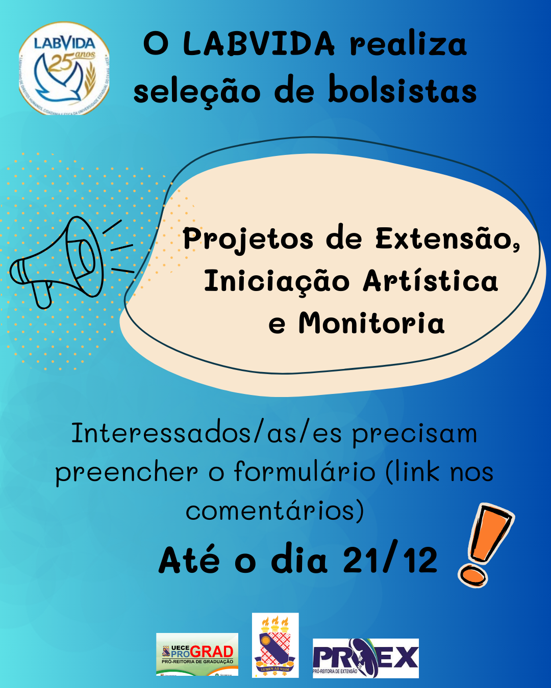 O Laboratório de Direitos Humanos, Cidadania e Ética – LABVIDA, realiza seleção de bolsistas para Projetos de Extensão, Iniciação Artística e Monitoria.
