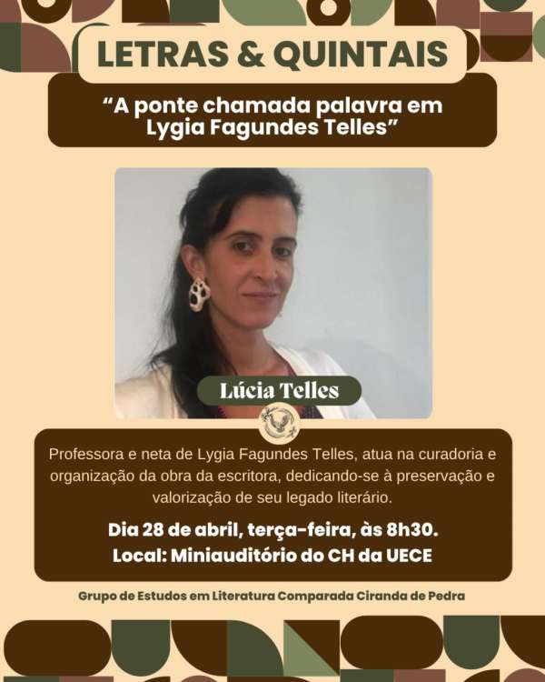 Nesta ocasião, contaremos com a participação de Lucia Telles — professora, curadora e neta da escritora Lygia Fagundes Telles. O tema desta edição será “A ponte chamada palavra em Lygia Fagundes Telles.”