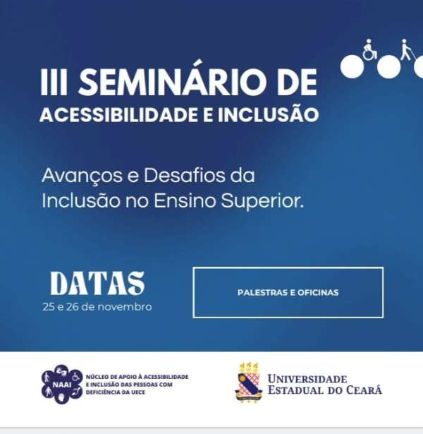 O Núcleo de Apoio à Acessibilidade e Inclusão das Pessoas com Deficiência (NAAI/Uece) realizará, nos dias 25 e 26 de novembro, no campus Itaperi, o III Seminário de Acessibilidade e Inclusão, que terá como tema “Avanços e Desafios da Inclusão no Ensino Superior”.