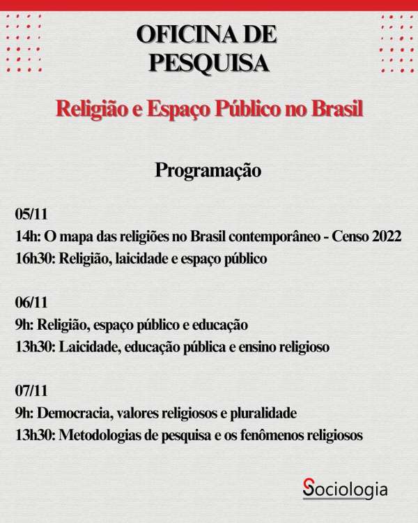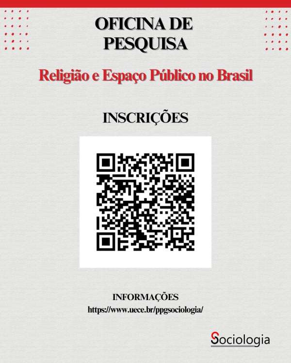 O PPGS realizará, entre 05 e 07/11, a Oficina de Pesquisa Religião e Espaço Público no Brasil, ministrada pelo professor Emerson Sena (UFJF). A carga horária será de 30h/a e ocorrerá nos turnos manhã e tarde. Inscrições podem ser realizadas via QR Code até 28/10.
