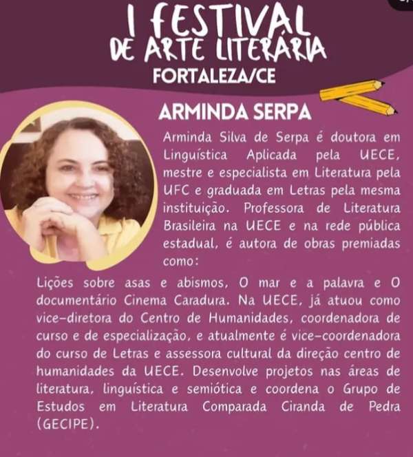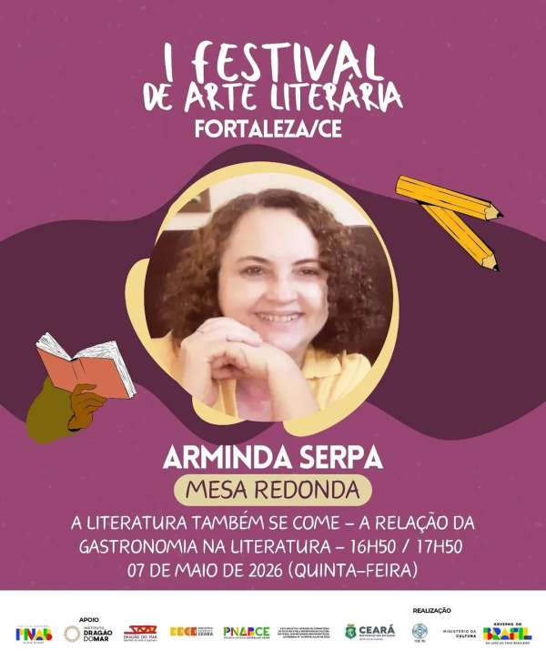 “A Literatura também se come: a relação da gastronomia na Literatura” é o tema da mesa redonda que contará com a participação de Arminda Serpa, Sarah Diva Ipiranga e Marina Araújo.