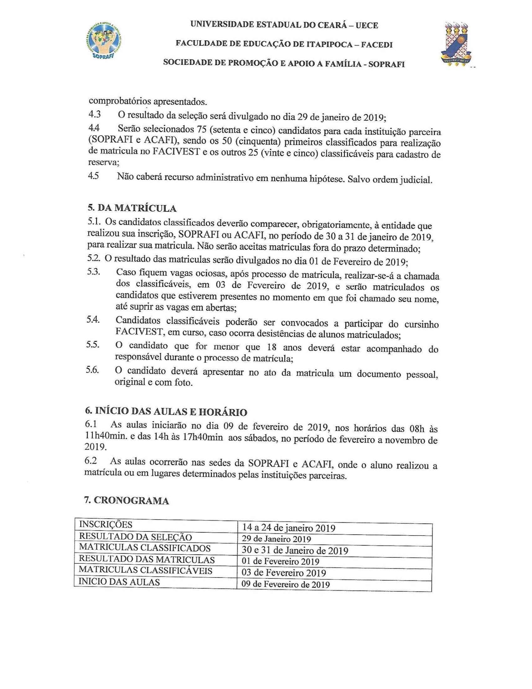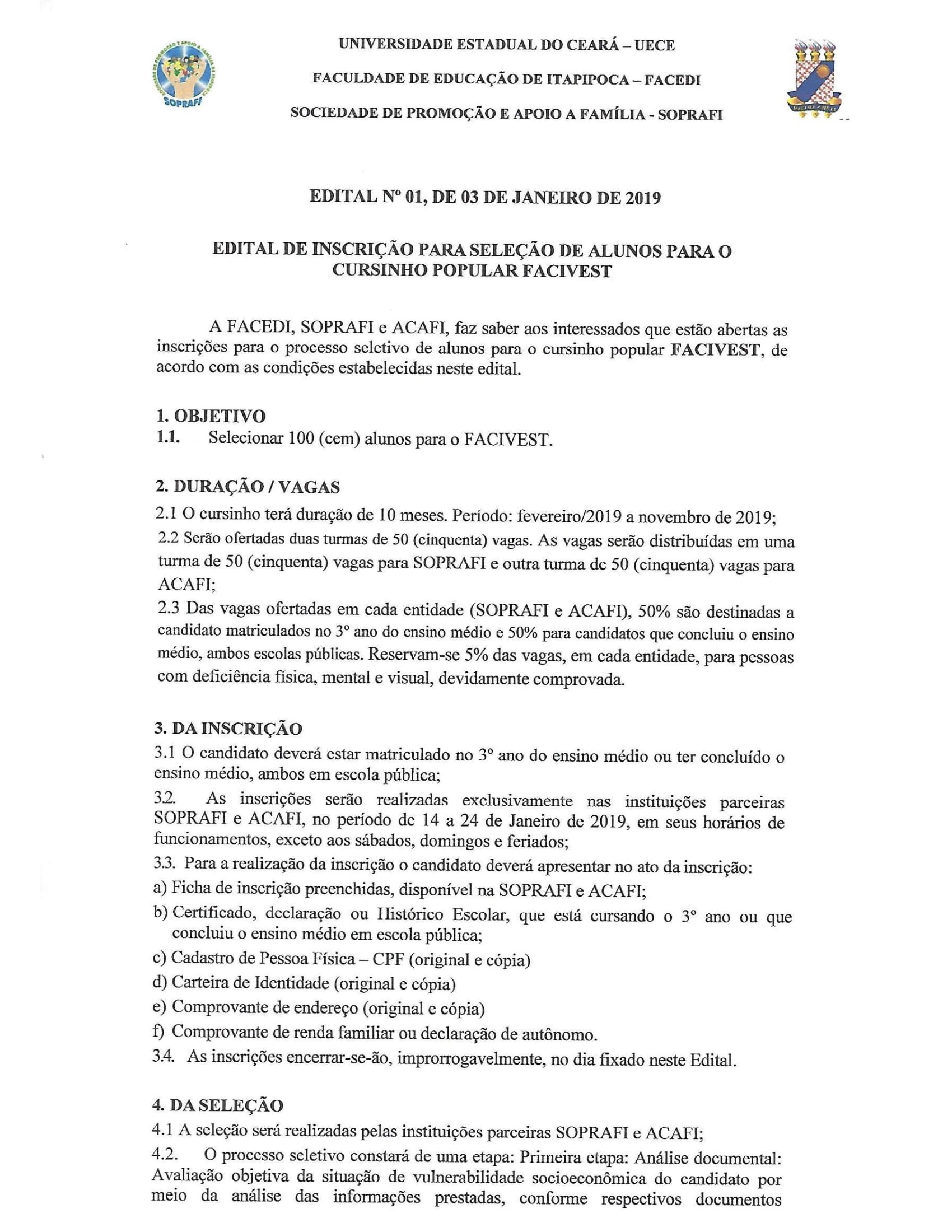 O cursinho popular FACIVEST abre inscrições para o preenchimento de 100 (cem) vagas para novos alunos, entre os dias 14 e 24 de janeiro. O cursinho é uma realização da FACEDI (por meio de alunos-professores que atuam a partir do PET-UECE), a SOPRAFI (Sociedade de Apoio a Família de Itapipoca) e a ACAFI (Associação Comunitária de Assistência à Família de Itapipoca), sob a coordenação do Prof.Dr. Furtado Lins, diretor da FACEDI.