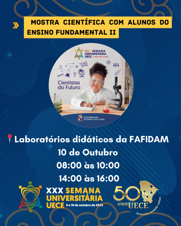 A III Mostra Cientista do Futuro, acontecerá na sexta (10) de outubro, marcando o último dia da XXX Semana Universitária da UECE na Faculdade de Filosofia Dom Aureliano Matos (FAFIDAM).