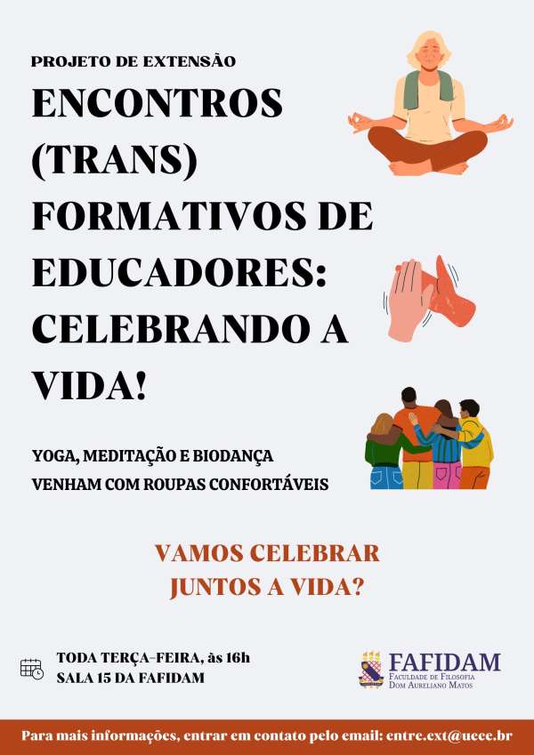 Descrição: Card com fundo cinza claro com os escritos Projeto de Extensão: Encontros (Trans)formativos de Educadores Celebrando a Vida! Yoga, Meditação e Biodança. Venham com roupas confortáveis. À direita, há ilustrações de uma pessoa sentada meditando, abaixo duas mãos se tocando e, em seguida, quatro pessoas de costas abraçadas. Centralizado, na parte inferior do card, há os dizeres “Vamos celebrar juntos a vida?”. Toda terça-feira às 16h, sala 15 da Fafidam. Ao lado direito, há a marca institucional da Fafidam. Na base do card, com fundo vermelho e letras brancas, está escrito: Para mais informações, entrar em contato pelo email: entre.ext@uece.br