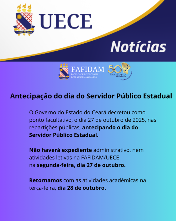 Dessa forma, não haverá expediente administrativo nem atividades letivas na Faculdade de Filosofia Dom Aureliano Matos (FAFIDAM/UECE) na segunda-feira, dia 27 de outubro.
