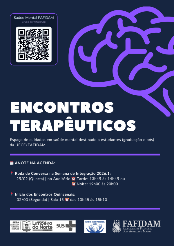 #Descrição da imagem: Cartaz referente aos Encontros Terapêuticos na Fafidam. Fundo azul escuro. No canto superior esquerdo, há o QR Code para entrar no grupo do Whatsapp. No canto superior direito, há a ilustração, em linhas roxas, de um cérebro. Logo abaixo, há os seguintes textos, em letra na cor branca, alinhados à esquerda: Encontros terapêuticos. Espaço de cuidados em saúde mental destinado a estudantes (graduação e pós) da UECE/FAFIDAM. Anote na agenda: Roda de Conversa na Semana de Integração 2026.1: 25/02 (Quarta), no Auditório. Tarde: 13h45 às 14h45 ou Noite: 19h00 às 20h00. Início dos Encontros Quinzenais: 02/03 (Segunda), Sala 15 das 13h45 às 15h10. Na parte inferior do cartaz, há as marcas da Secretaria Municipal de Saúde de Limoeiro do Norte (SESA), do Sistema Único de Saúde (SUS), do Centro de Atenção Psicossocial (CAPS II) e da Faculdade de Filosofia Dom Aureliano Matos (FAFIDAM). #Fim da descrição.