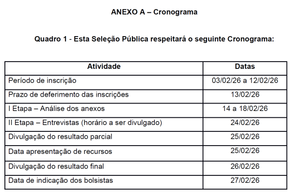 O resultado final será publicado em 26 de fevereiro de 2026, com indicação dos bolsistas prevista para 27 de fevereiro de 2026.