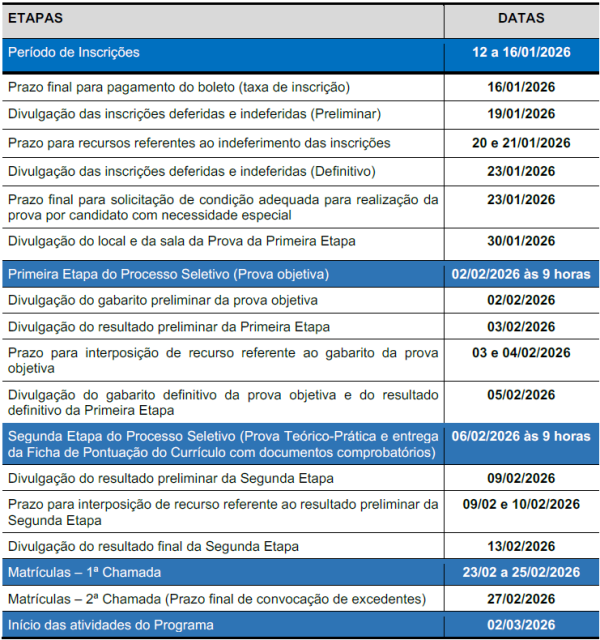 Período de Inscrições: 12 a 16 de janeiro de 2026.