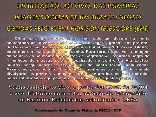 Física Fecli DIVULGAÇÃO, AO VIVO, DAS PRIMEIRAS IMAGENS DIRETAS DE UM BURACO NEGRO OBTIDAS PELO EHT 7 de abril de 2019 - 13:20 Voltar ao topo Compartilhar