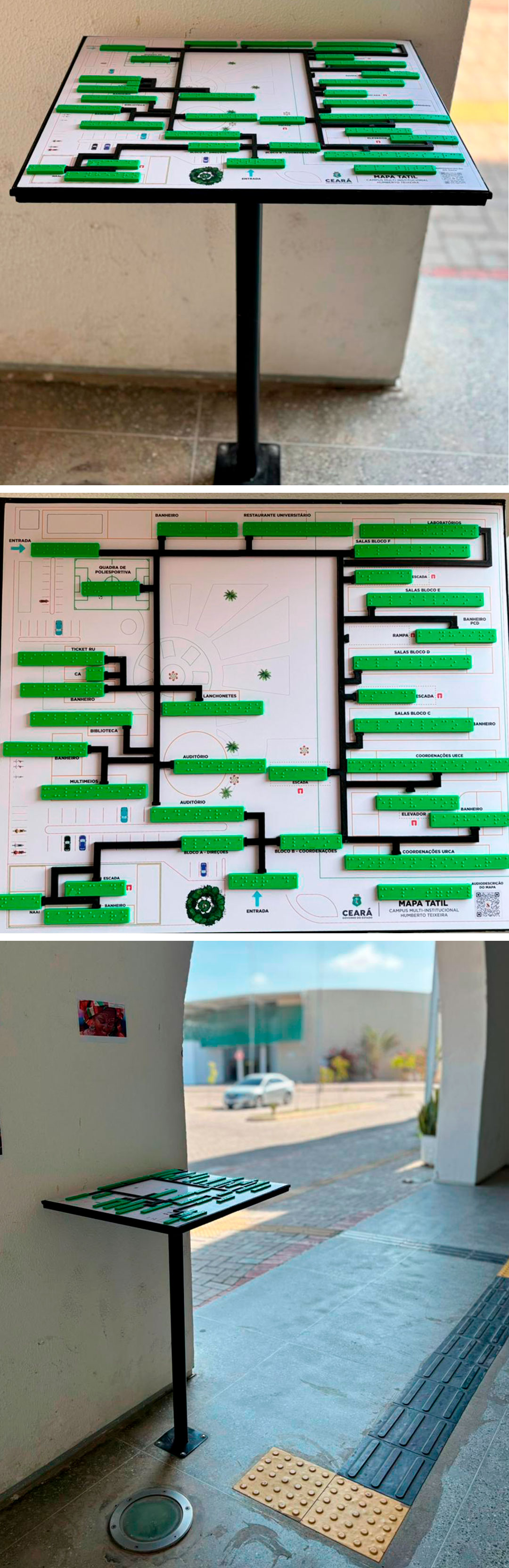 Complementando o painel físico, o mapa tátil conta com um QR Code integrado, que direciona o usuário para uma audiodescrição completa do campus. Esse recurso amplia o acesso à informação e favorece diferentes perfis de usuários, proporcionando uma experiência mais completa e independente.