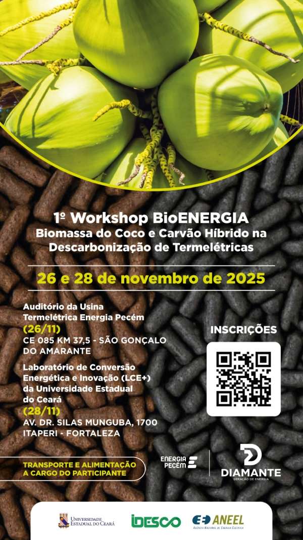 Como parte do projeto “Carvão Híbrido” PDI Aneel @aneelgovbr: Energia Pecém | Grupo Diamante @energiapecem @diamante.energia e a Universidade Estadual do Ceará @ueceoficial, foi realizado nos últimos dias 26 e 28 de novembro o 1o Workshop Bioenergia – Biomassa do Coco e Carvão Híbrido na Descarbonização de Termelétricas.