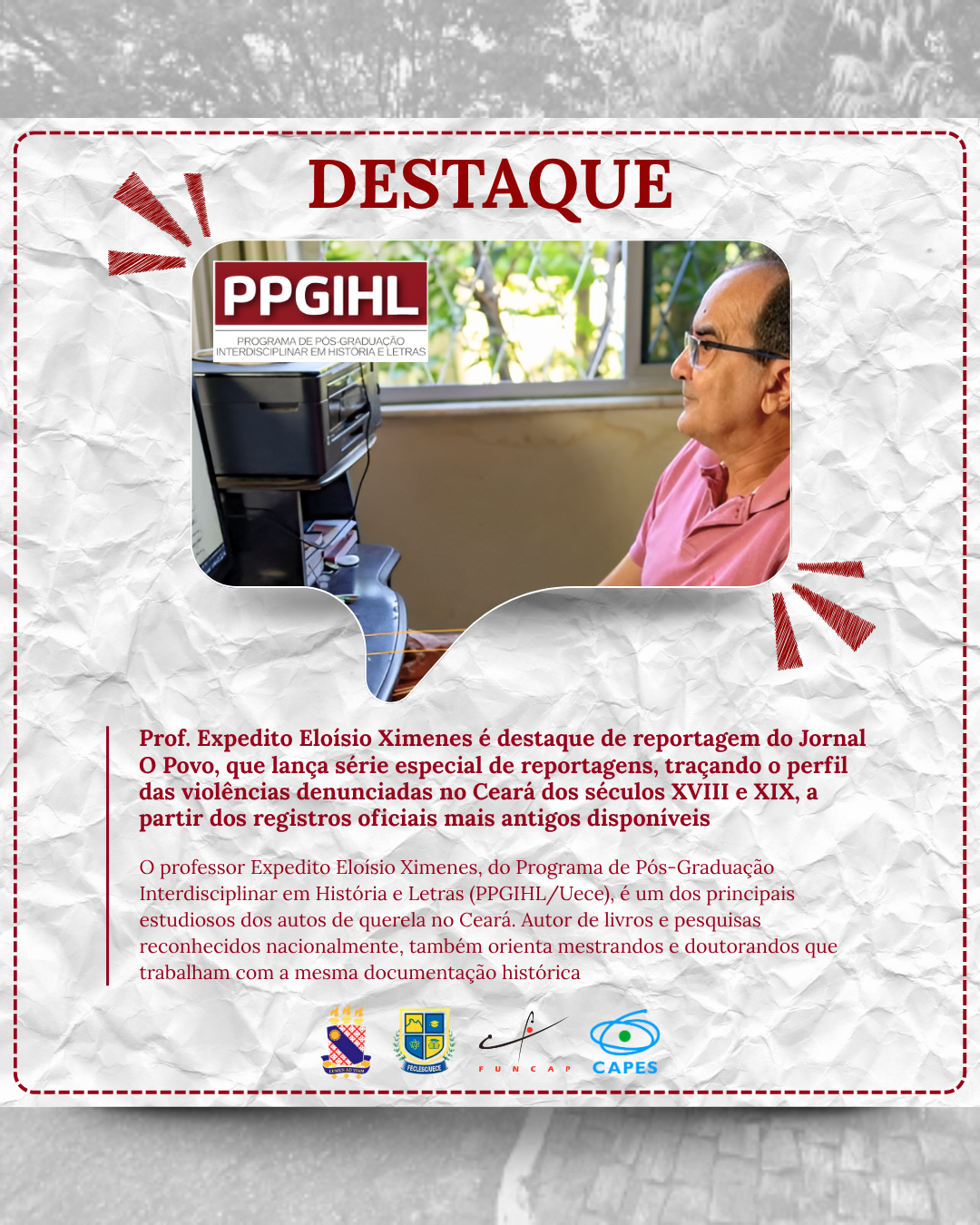 O Programa de Pós-Graduação Interdisciplinar em História e Letras (PPGIHL/UECE) parabeniza o professor Expedito Eloísio Ximenes pelo destaque em reportagem do Jornal O Povo. O docente é reconhecido por sua pesquisa sobre os autos de querela cearenses, que são documentos judiciais dos séculos XVIII e XIX. Esses registros trazem denúncias e conflitos da época — como casos de violência, disputas e injustiças — e servem como fonte histórica para compreender a formação social e os padrões de violência no Ceará colonial.
