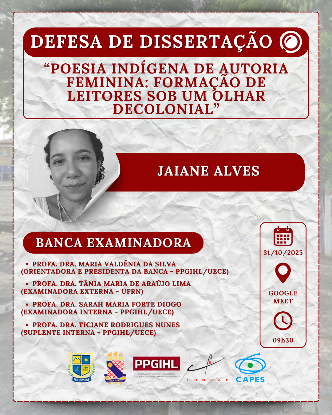 O Programa de Pós-Graduação Interdisciplinar em História e Letras tem a honra de divulgar a defesa de dissertação de Jaiane Alves, intitulada: “POESIA INDÍGENA DE AUTORIA FEMININA: FORMAÇÃO DE LEITORES SOB UM OLHAR DECOLONIAL”.