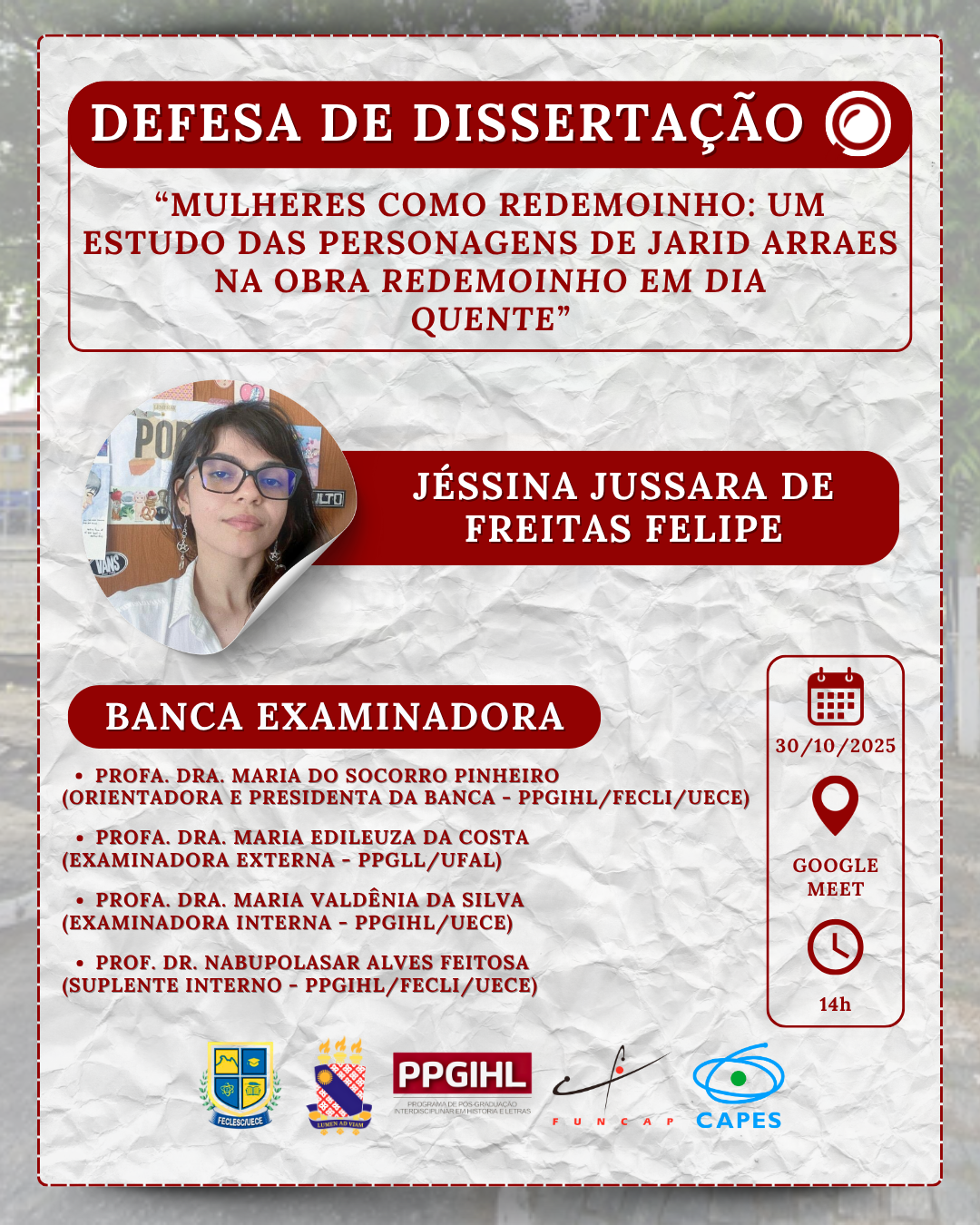 O Programa de Pós-Graduação Interdisciplinar em História e Letras tem a honra de divulgar a defesa de dissertação de Jéssina Jussara de Freitas Felipe, intitulada: “MULHERES COMO REDEMOINHO: UM ESTUDO DAS PERSONAGENS DE JARID ARRAES NA OBRA REDEMOINHO EM DIA QUENTE”.