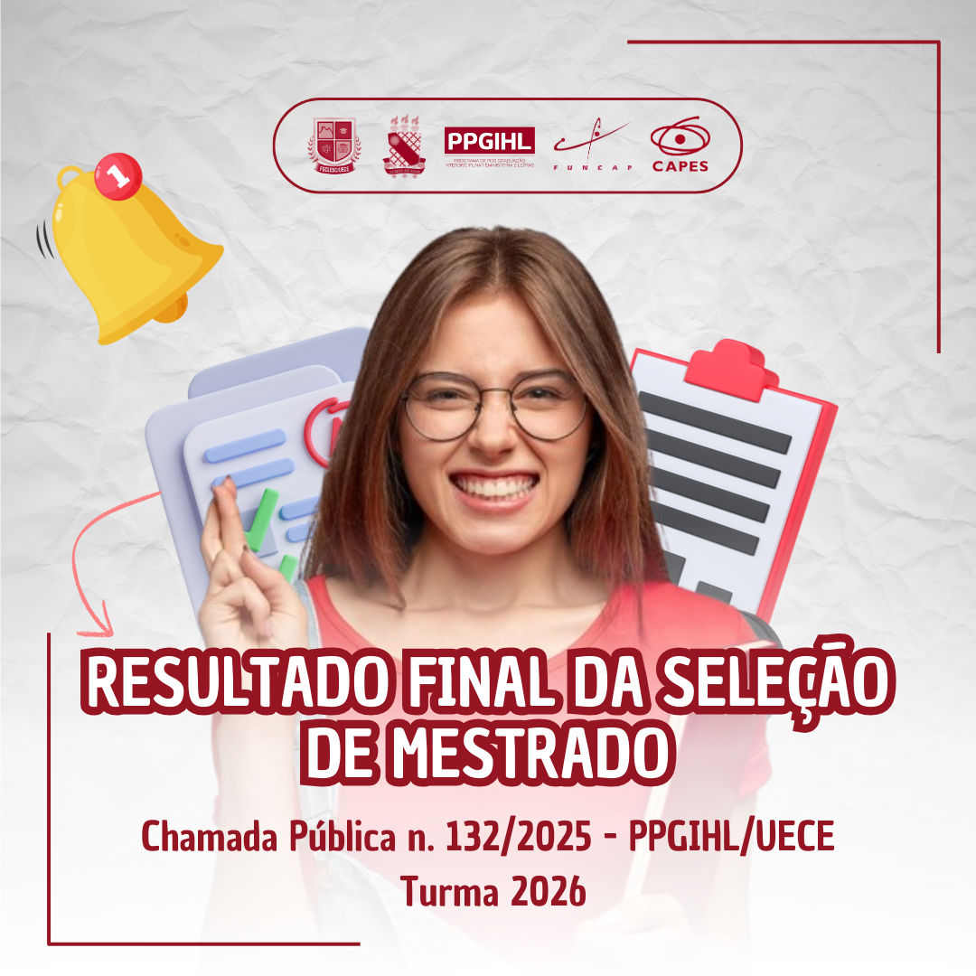 O Programa de Pós-Graduação Interdisciplinar em História e Letras divulga o resultado final da seleção de mestrado da Chamada Pública n. 132/2025 do PPGIHL/UECE – Turma 2026: