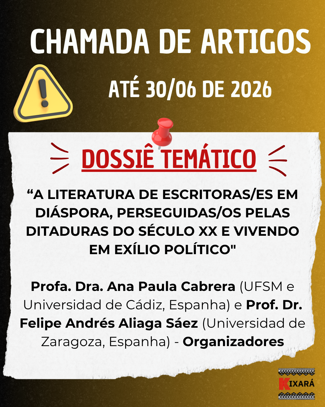 A KIXARÁ, revista científica do Programa Interdisciplinar em História e Letras (PPGIHL/Feclesc/Uece), receberá, até 30 de junho de 2026, ARTIGOS que tratem do tema “A literatura de escritoras em diáspora, perseguidas pelas ditaduras do século XX e vivendo em exílio político” — em português, inglês, espanhol, francês, galego e línguas indígenas — que sigam as nossas normas de publicação.