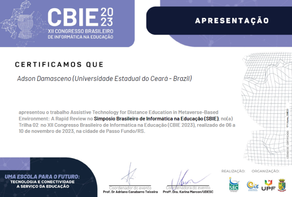 O docente do curso de Sistemas de Informação do Campus Avançado de Mombaça (FECLI/UECE), Adson Roberto Pontes Damasceno, participou do Simpósio Brasileiro de Informática na Educação (SBIE) — um dos principais eventos que compõem o CBIE — apresentando o artigo intitulado “Assistive Technology for Distance Education in Metaverse-Based Environment: A Rapid Review”. O artigo faz parte da pesquisa de doutorado do docente e foi aceito na trilha da conferência intitulada “Jogos, Simuladores e Tecnologias Emergentes na Educação”.