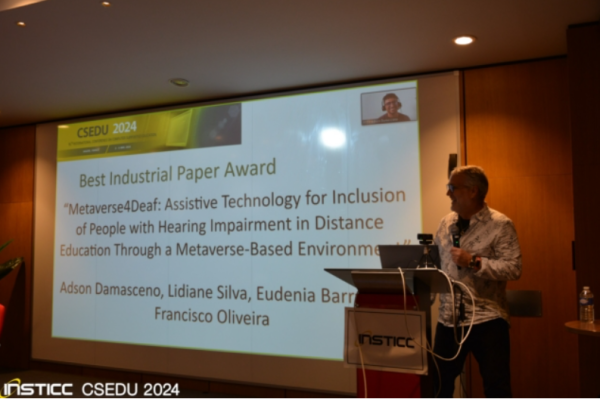 Além disso, o trabalho foi premiado como “Best Industrial Paper” (Melhor Artigo Industrial) na conferência, reconhecendo sua relevância e aplicabilidade no contexto de tecnologias assistivas e educação inclusiva em ambientes imersivos, Certificate best industrial paper csedu 2024.