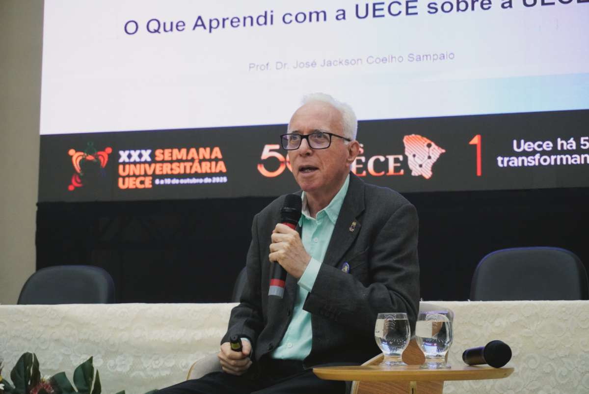 Professor Jackson Sampaio compartilhou breve apresentação com o tema “O que aprendi com a Uece sobre a Uece” e trouxe um contexto histórico da evolução das universidades, traçando um paralelo com o desenvolvimento da Uece e seu, enquanto gestor. “Eu me sinto muito orgulhoso da história que eu desenvolvi com a Uece e que a Uece desenvolveu com a minha ajuda”, ressaltou.