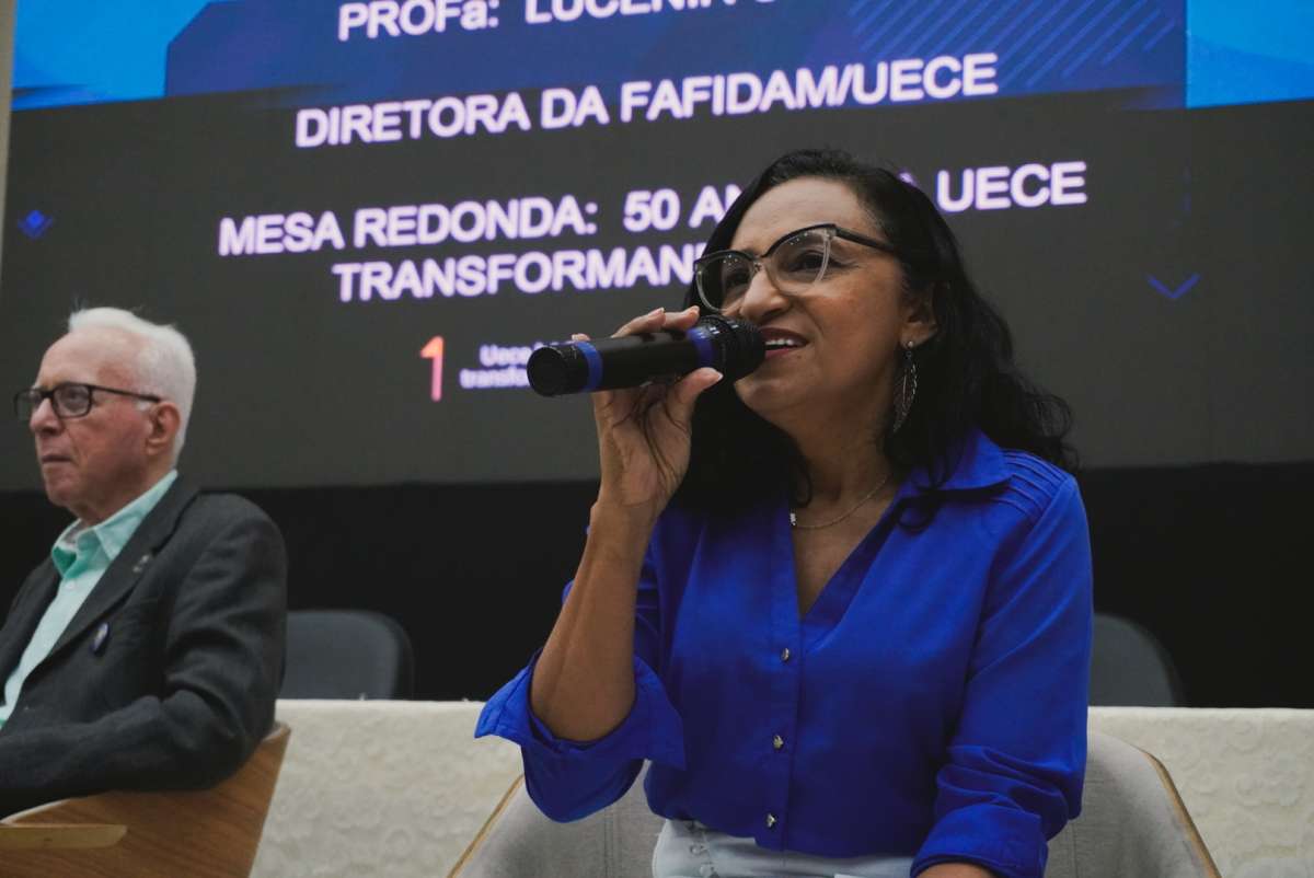Professora Lucenir falou sobre sua trajetória. “Eu trago um pouco da minha história, a qual tenho certeza que não é muito diferente da história de muitos outros professores e alunos dos campi da Uece no interior do Ceará”. Falou das experiências na Fafidam/Uece, enquanto docente e enquanto gestora; e parabenizou a Uece, bem como os seus membros. “Parabéns a Uece pelos seus 50 anos e parabéns para todos nós que tivemos as nossas vidas transformadas pela Universidade Estadual do Ceará”.