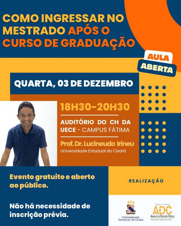 Ministrada pelo professor da Uece, Lucineudo Irineu, a aula acontecerá no auditório do Centro de Humanidades (CH), no campus Fátima, das 18h30 às 20h30.