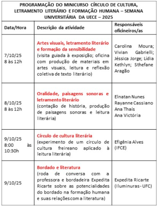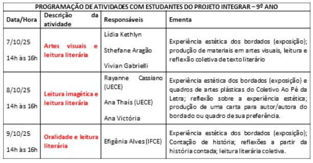 Além da exposição, as peças bordadas serão utilizadas no minicurso “Círculo de cultura, letramento literário e formação humana”, também realizado no local, e em atividades voltadas a estudantes do 9º ano do ensino fundamental da rede pública municipal de Fortaleza participantes do projeto Integração Uece.