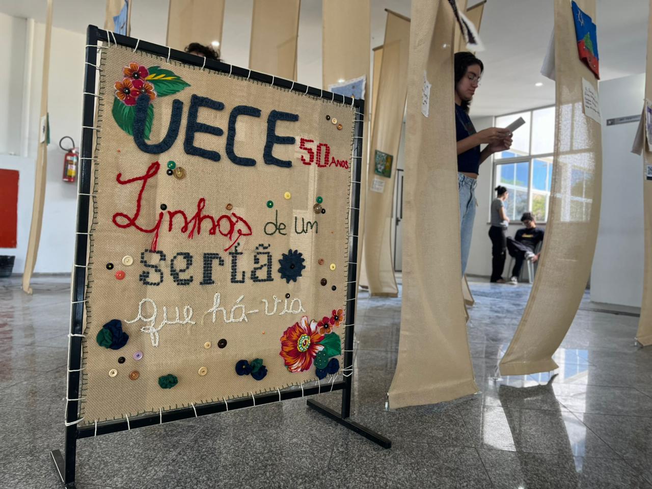 Durante a XXX Semana Universitária da Universidade Estadual do Ceará (Uece), que acontece de 6 a 10 de outubro de 2025, o hall da Reitoria recebe a exposição “Linhas de um sertão que há-via”, uma mostra que une literatura e bordado em um diálogo sensível entre texto e imagem.