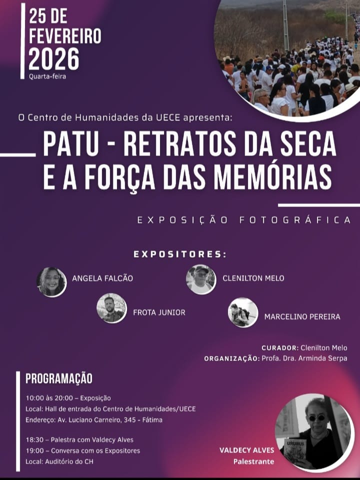 Como parte da programação da Semana de Integração do curso de Letras, o Centro de Humanidades (CH) da Uece convida toda a comunidade universitária para a exposição fotográfica “Patu: Retratos da Seca e a Força das Memórias”, que acontecerá nesta quarta-feira (25), das 10h às 20h, no campus Fátima.
