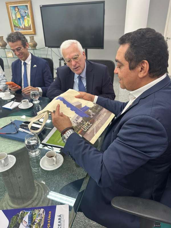 O embaixador presenteou o reitor Hidelbrando com o livro. Já o reitor deu de presente ao embaixador uma sacola com a foto do Prédio da Reitoria e um Folder feito com exclusividade para a Uece.