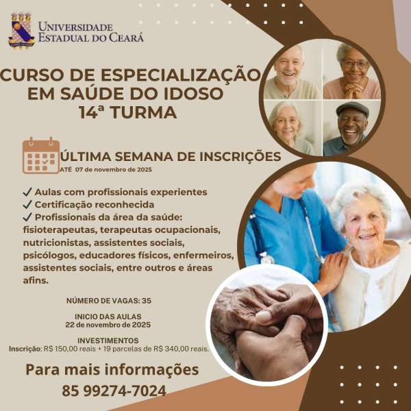 Seguem abertas até a próxima sexta-feira, 7 de novembro, as inscrições para a Especialização em Saúde do Idoso, coordenada pelo Centro de Humanidades (CH), da Universidade Estadual do Ceará (Uece).