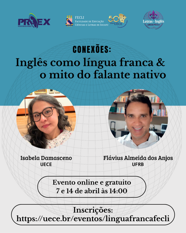 Estão abertas as inscrições para o “Conexões: Inglês como língua franca e o mito do falante nativo”, um evento online e gratuito promovido pelo curso de Letras-Inglês da Faculdade de Educação, Ciências e Letras de Iguatu (Fecli/Uece). Podem participar estudantes, pesquisadores e professores de línguas de todos os níveis da educação.
