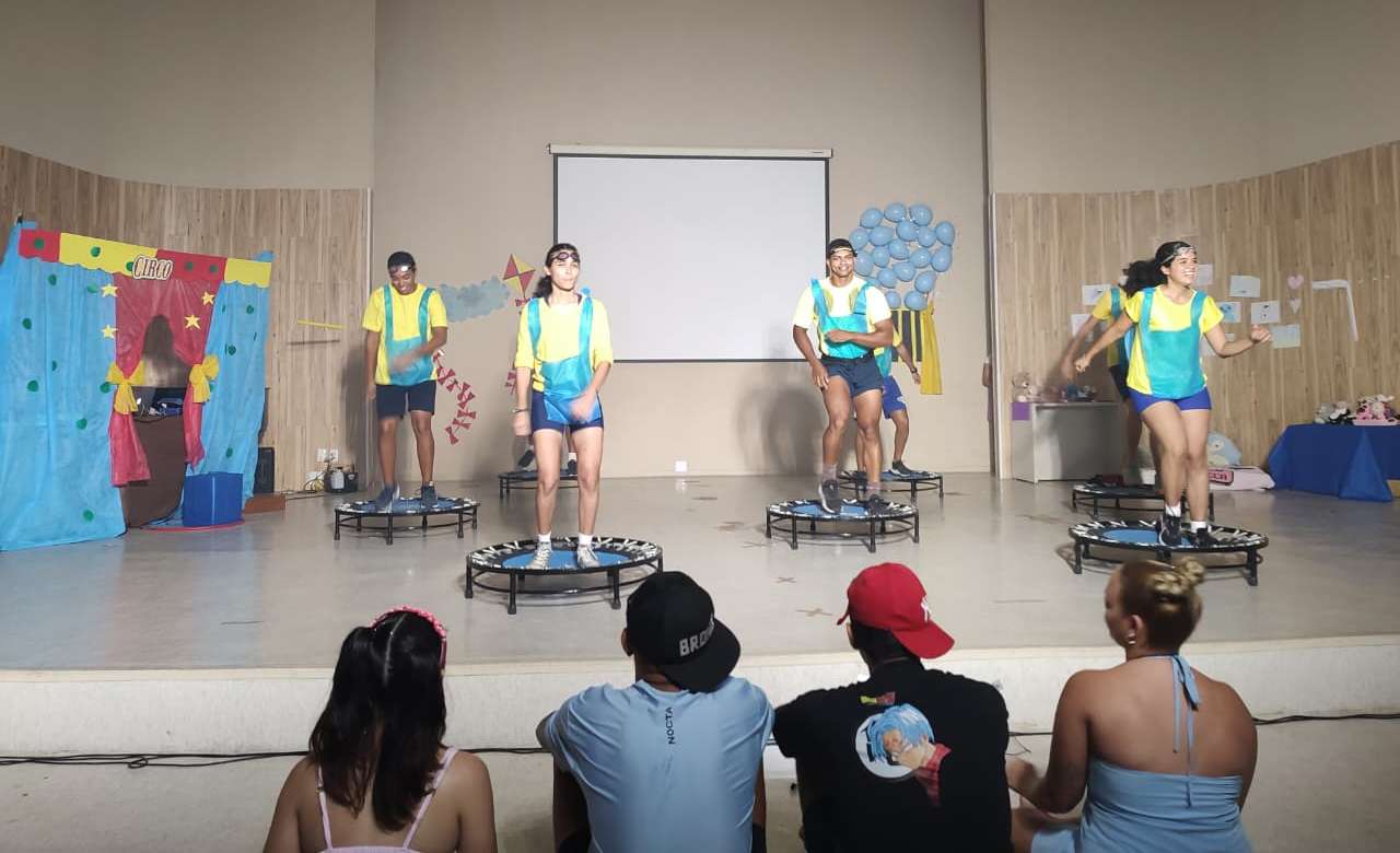 Já no corredor e no hall do auditório, a recepção envolvia os participantes em jogos e brincadeiras, como amarelinha, pula corda, pinturas e outras atividades. Ao passar pela cortina de entrada, o público era surpreendido pela decoração infantil no palco e por um ambiente iluminado que remetia ao universo lúdico.