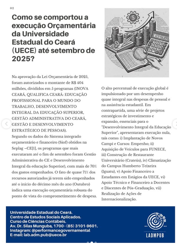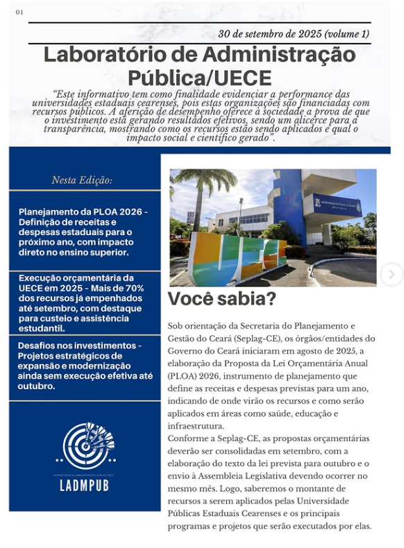 O Laboratório de Administração Pública da Universidade Estadual do Ceará (LADMPUB/UECE) lançou, no dia 30 de setembro de 2025, a primeira edição do Boletim Informativo das Universidades Públicas Estaduais Cearenses. A publicação tem como finalidade evidenciar a performance das universidades estaduais, destacando o uso dos recursos públicos e o impacto social e científico gerado por essas instituições.