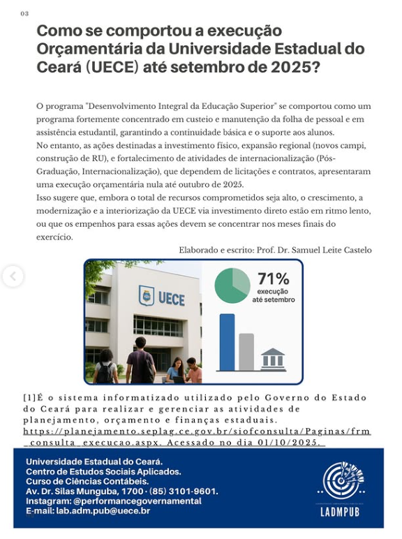 Elaborado e escrito pelo professor Samuel Leite Castelo, o boletim nasce como uma iniciativa para ampliar a transparência e aproximar a sociedade do funcionamento das universidades estaduais do Ceará. A proposta é oferecer à população informações claras e acessíveis sobre como os recursos públicos são aplicados, quais resultados estão sendo alcançados e quais desafios ainda precisam ser enfrentados.