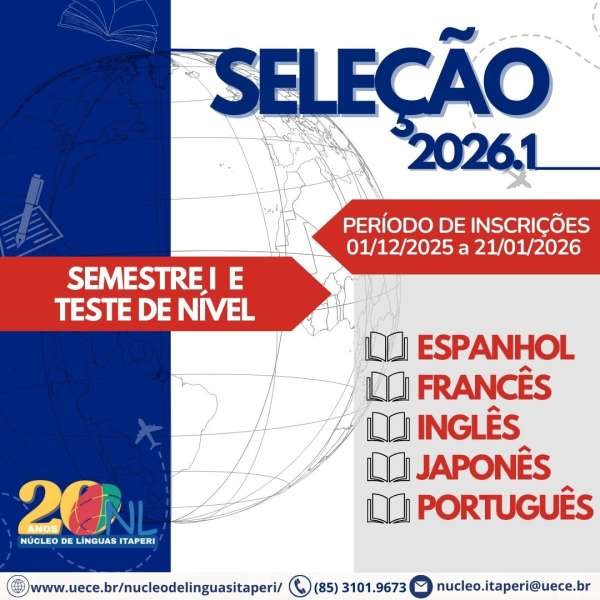 O Núcleo de Línguas do campus Itaperi, da Universidade Estadual do Ceará (Uece), está com inscrições abertas para o teste de admissão aos cursos de Espanhol, Francês, Inglês, Japonês e Português. São oferecidas 400 vagas, distribuídas entre as modalidades presencial e à distância.