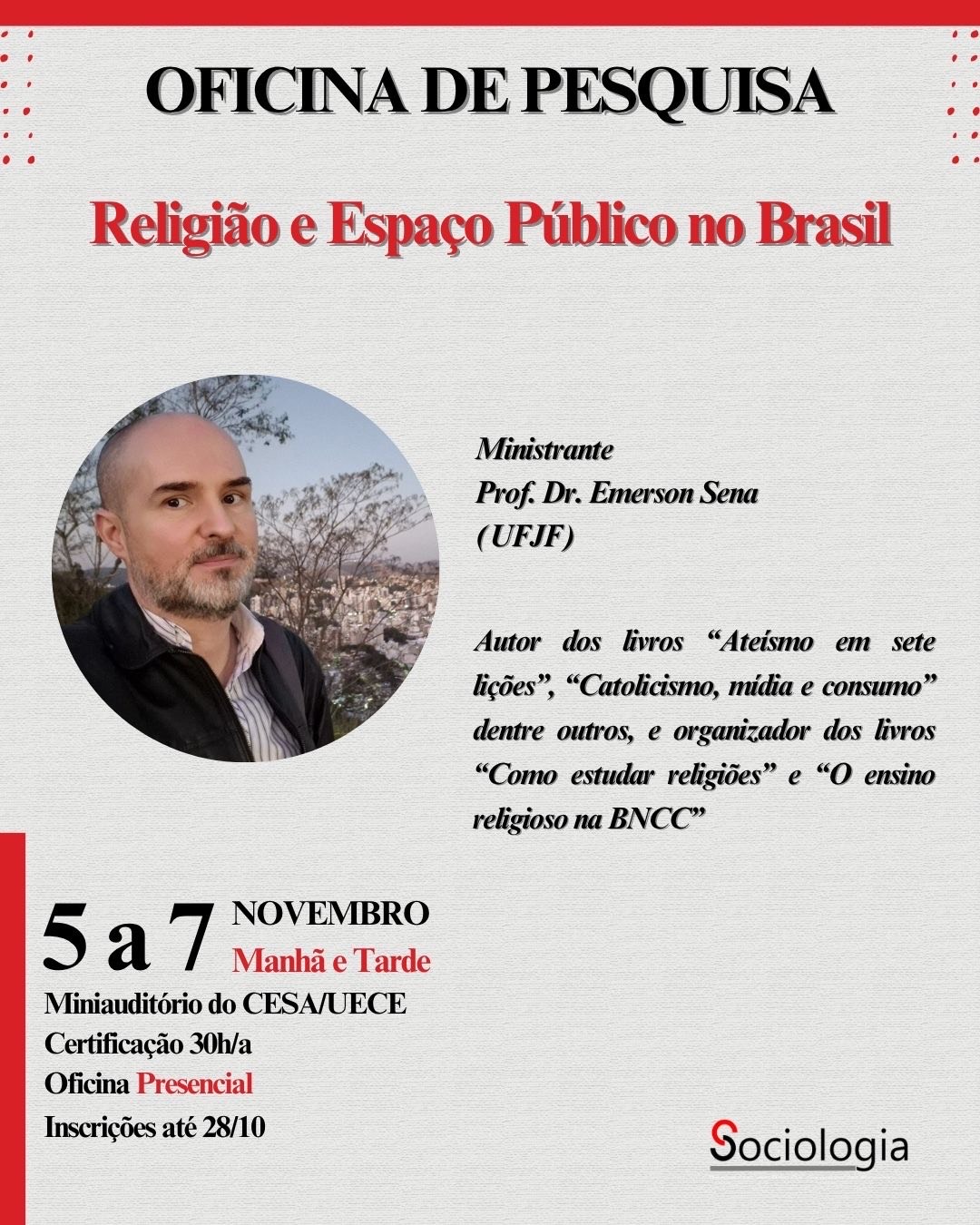 O Programa de Pós-Graduação em Sociologia (PPGS/Uece) realizará, entre 5 e 7 de novembro, a oficina de pesquisa Religião e Espaço Público no Brasil, ministrada pelo professor da Universidade Federal de Juiz de Fora (UFJF), Emerson Sena.