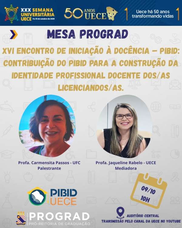 A atividade integra a programação da XXX Semana Universitária da Uece, cujo tema é “Uece há 50 anos transformando vidas”, e tem como objetivo estimular o diálogo sobre o papel do PIBID na formação de futuros professores, destacando as experiências, desafios e aprendizados vivenciados pelos bolsistas ao longo do programa.