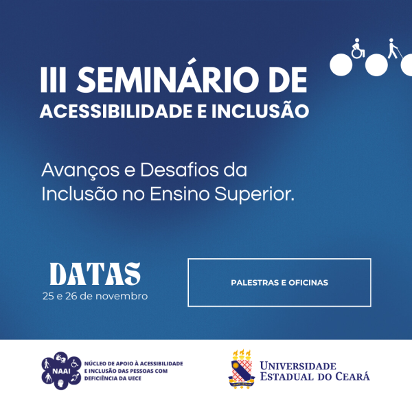 O Núcleo de Apoio à Acessibilidade e Inclusão das Pessoas com Deficiência (NAAI/Uece) realizará, nos dias 25 e 26 de novembro, no campus Itaperi, o III Seminário de Acessibilidade e Inclusão, que terá como tema “Avanços e Desafios da Inclusão no Ensino Superior”.