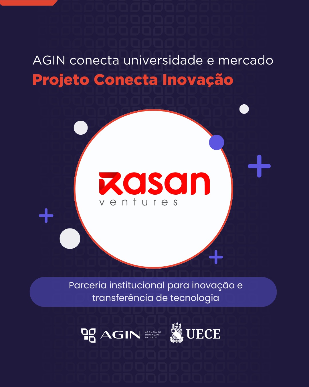 A Universidade Estadual do Ceará (Uece), por meio da sua Agência de Inovação (Agin), firmou um Acordo de Cooperação Técnica com a empresa Rasan Ventures LTDA., com o objetivo de fortalecer o ecossistema de inovação, ampliar a transferência de tecnologia e aproximar a universidade do setor produtivo. A parceria viabiliza a execução do projeto Conecta Inovação, que será desenvolvido no âmbito da instituição.