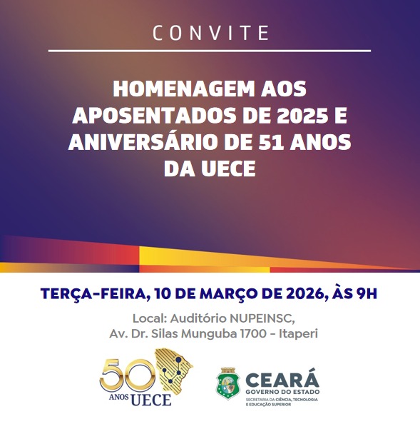 Ocorre nesta terça-feira, 10 de março, cerimônia em homenagem aos servidores da Uece aposentados no ano de 2025. Ao todo, 46 servidores docentes e servidores técnico-administrativos que foram lotados nos campi da capital e do interior serão homenageados no evento que ocorrerá no Auditório do NUPEINSC, no campus Itaperi, às 9h. O evento marca também a comemoração dos 51 anos da Universidade Estadual do Ceará.