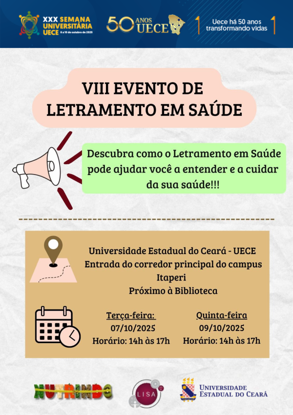 Nos dias 7 e 9 de outubro, a Universidade Estadual do Ceará (Uece), por meio do Laboratório de Nutrição e Doenças Crônicas (Nutrindo), realizará um evento gratuito e aberto ao público sobre Letramento em Saúde. A atividade integra a programação da XXX Semana Universitária da Uece e será realizada na entrada do corredor central do campus Itaperi, das 14h às 17h.