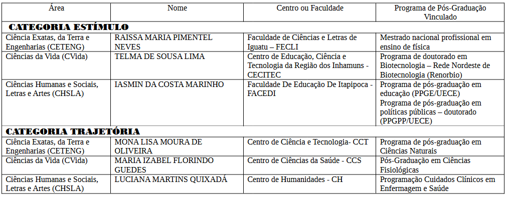 Um dos momentos mais aguardados da programação foi a entrega do Prêmio Elas na Ciência, que reconhece pesquisadoras da Uece em duas categorias, Estímulo e Trajetória, contemplando três grandes áreas do conhecimento: Ciências da Vida; Ciências Exatas, da Terra e Engenharias; e Ciências Humanas e Sociais, Letras e Artes. A iniciativa busca valorizar a contribuição de pesquisadoras da instituição para o avanço da ciência, da tecnologia e da inovação. As vencedoras foram anunciadas pela diretora de pesquisa da PROPGPq, professora Célia Sampaio: