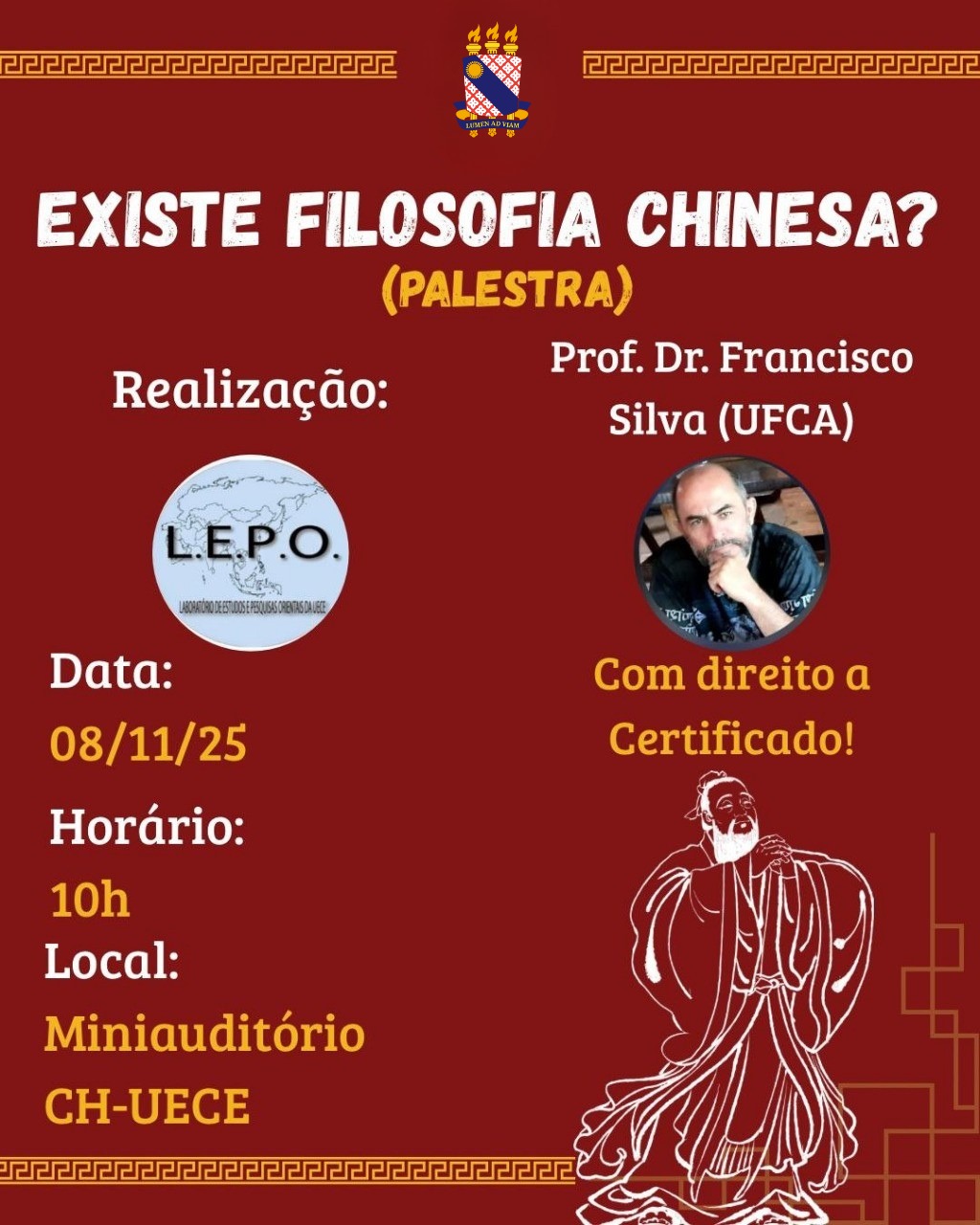 A Universidade Estadual do Ceará (Uece) receberá, neste sábado (8), o docente de Filosofia Oriental na Universidade Federal do Cariri (UFCA), Francisco José da Silva, para ministrar a palestra “Existe Filosofia Chinesa?”. O evento acontecerá a partir das 10h, no miniauditório do Centro de Humanidades, no campus de Fátima, em Fortaleza.