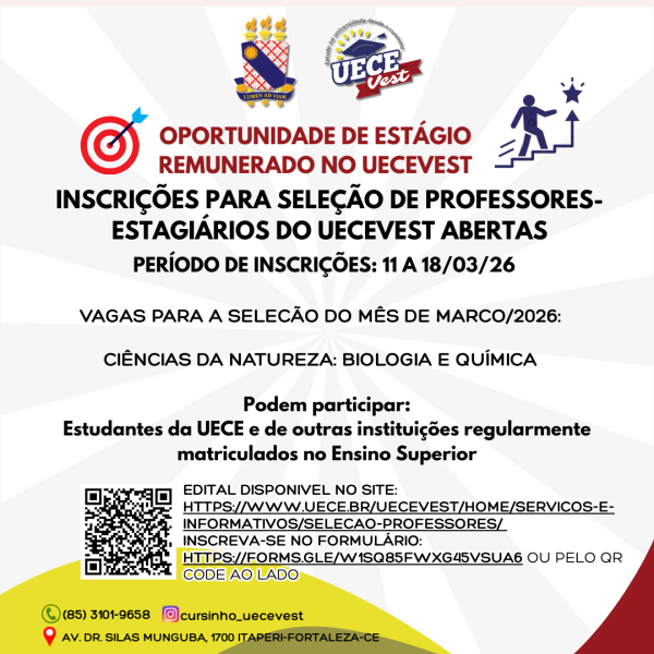 A seleção constará de análise de histórico e avaliação didática. Para os aprovados e convocados, a duração do estágio será de até 24 meses, no UeceVest, campus Itaperi.