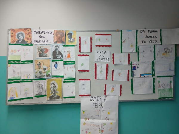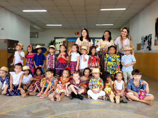 Essa ação teve início com uma roda de conversa, na qual as crianças compartilharam suas experiências com a cultura nordestina. Após trazerem elementos da festa junina, como a decoração, comidas e roupas típicas, realizaram a confecção de bandeirinhas para enfeitar a sala nesse período festivo. As bandeirinhas foram decoradas com desenhos, escritas e colagens dos seus rostos das crianças.
