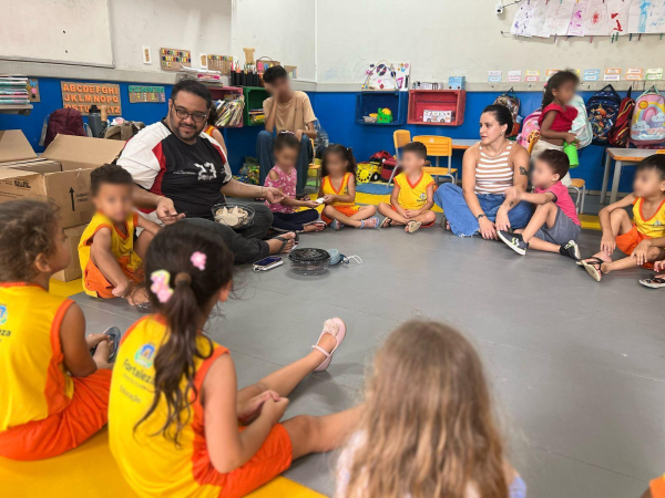 As bolsistas realizaram uma roda de conversa sobre os povos originários com um teatro de sombras da história “Tuíupe e o Maracá Mágico”. As crianças expressaram suas reflexões e confeccionaram maracás com materiais recicláveis, vivenciando o instrumento musical da cultura indígena.