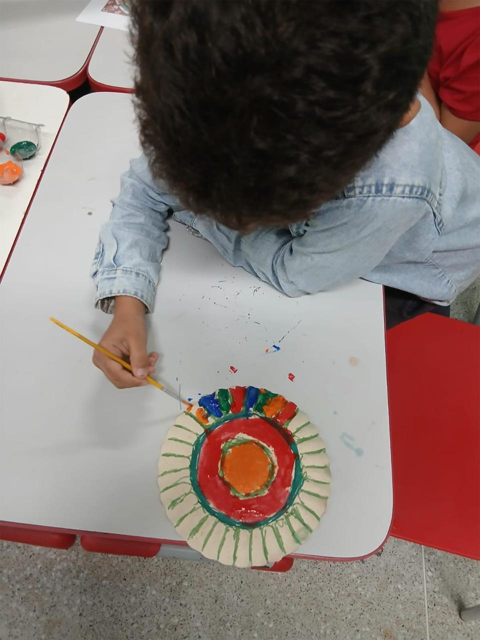 Como parte da culminância do projeto de intervenção “Protagonismo Infantil na Alfabetização: descobrindo o eu, reconhecendo o outro e tecendo o nós”, o mês de junho foi dedicado à finalização das produções que integrariam a exposição final. Entre as atividades desenvolvidas, destacou-se a oficina de mandalas, planejada para possibilitar às crianças a exploração de diferentes artefatos culturais e artísticos. Durante a atividade, foram apresentados os significados das mandalas em diversas culturas e, em seguida, as crianças confeccionaram suas próprias mandalas.