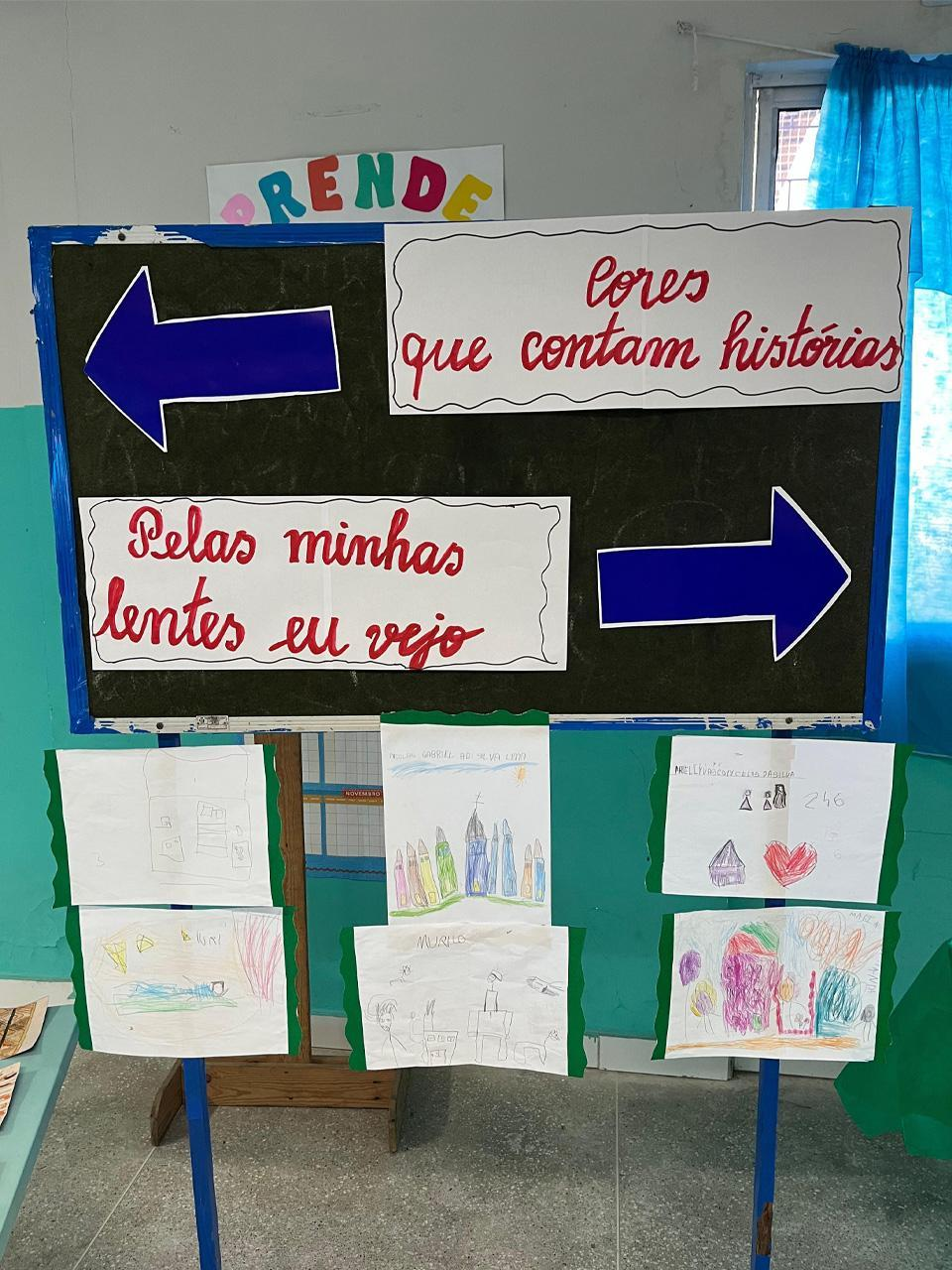 A exposição foi organizada em seções que refletiram as vivências das crianças: “Pelas minhas lentes eu vejo…”: com fotografias feitas pelas próprias crianças, registrando como viam o mundo ao seu redor. “Cores que contam histórias”: apresentando pinturas feitas com aquarela, tintas naturais e representações do céu, inspiradas na leitura do livro “Bernardo e o Céu Estrelado”, de Vinicius Ferraz. “Sinto o que sinto”: reunindo desenhos que expressavam suas percepções, emoções e vivências ao longo do semestre. “No ritmo do batuque”: com instrumentos musicais confeccionados pelas crianças. “Cirandando a vida”: momento interativo em que todos os presentes participaram de uma grande ciranda. “Que país é esse?”:  com registros fotográficos da visita à Caixa Cultural, realizada em abril. O nome da seção surgiu a partir da fala espontânea de algumas crianças que, ao retornarem da visita, perguntaram: “Que país é esse?”, revelando o impacto e o contraste entre o que vivenciaram e a realidade que conhecem.